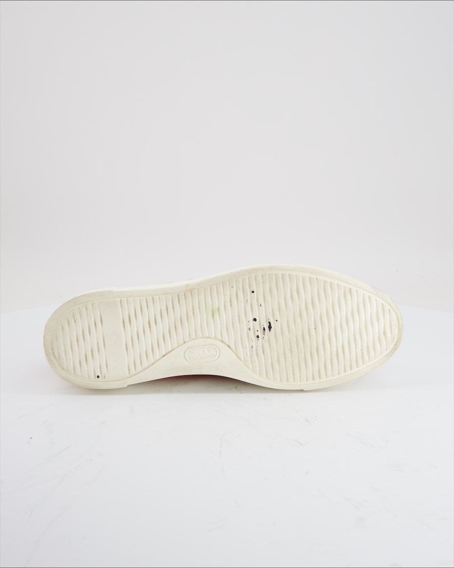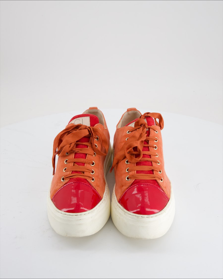 pink suede and red leather